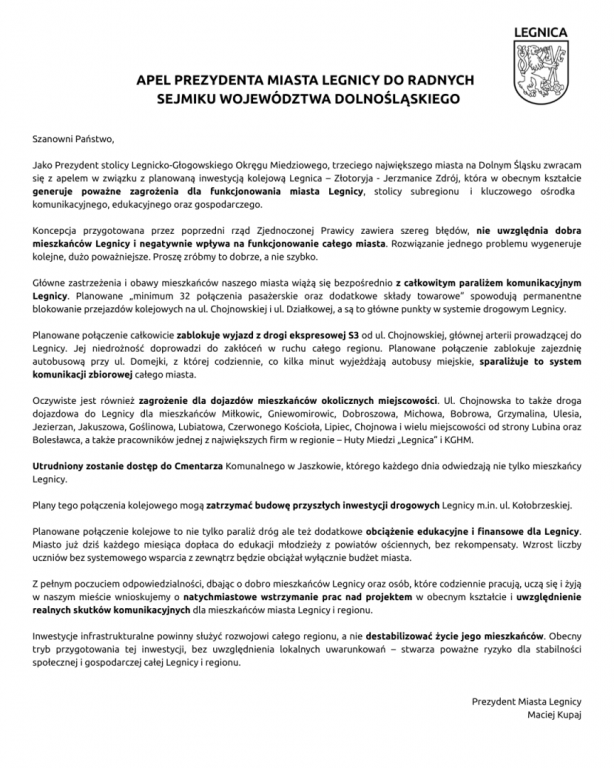 Jako Prezydent stolicy Legnicko-Głogowskiego Okręgu Miedziowego, trzeciego największego miasta na Dolnym Śląsku zwracam się z apelem w związku z planowaną inwestycją kolejową Legnica – Złotoryja - Jerzmanice Zdrój, która w obecnym kształcie generuje poważne zagrożenia dla funkcjonowania miasta Legnicy, stolicy subregionu i kluczowego ośrodka komunikacyjnego, edukacyjnego oraz gospodarczego.