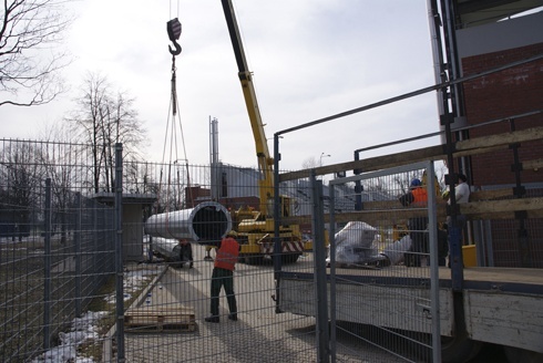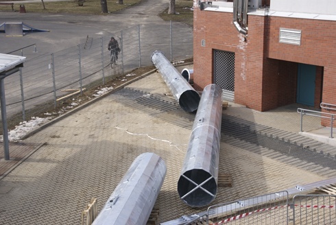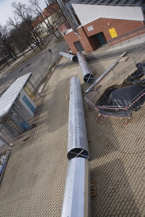 To na takich fundamentach staną 4 czterdziestometrowe maszty z platformami oświetleniowymi. Pierwsze potężne ich elementy zostały dziś (25 marca) dostarczone na plac budowy. Wkrótce przyjadą kolejne. Wcześniej budowlańcy przygotowali okablowanie i fundament pod stację kontenerową. Prace przebiegają zgodnie z harmonogramem, a ich finału możemy spodziewać się pod koniec kwietnia.