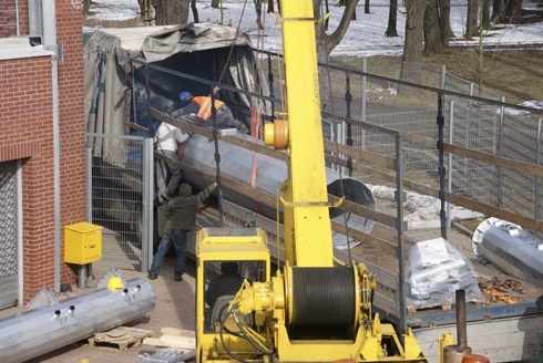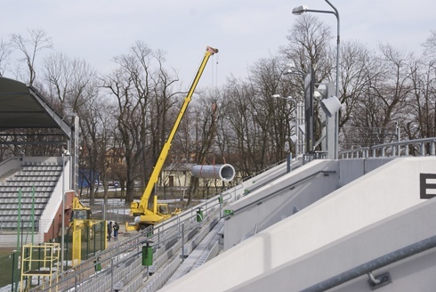 Budowy oświetlenia stadionu ciąg dalszy. Na plac wjechały gigantyczne maszty
