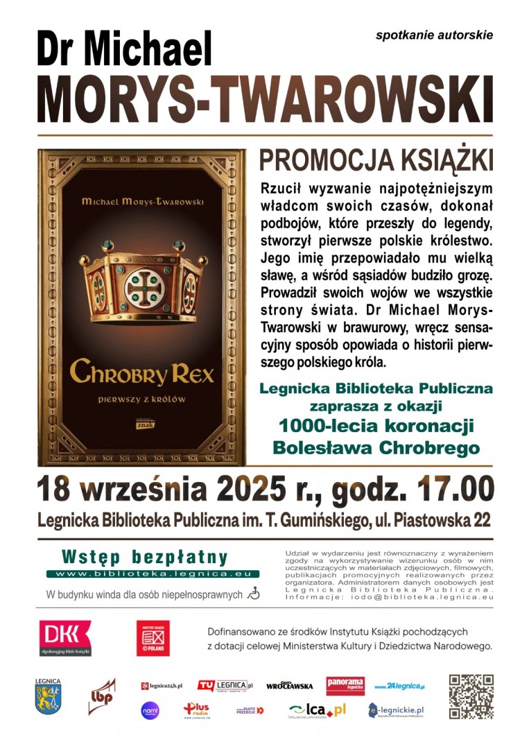 Z okazji 1000-lecia koronacji pierwszego króla Polski Legnicka Biblioteka Publiczna zaprasza na promocję książki „Chrobry Rex. Pierwszy z królów” oraz spotkanie autorskie z jej twórcą, dr. Michaelem Morysem-Twarowskim. Wydarzenie odbędzie się 18 września (czwartek) o godzinie 17.00, przy ul. Piastowskiej 22.