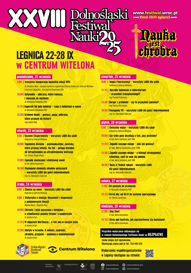 Program legnickiej edycji obejmuje różnorodne zagadnienia – od nauk ścisłych i przyrodniczych, przez medycynę, psychologię i prawo, aż po historię, literaturę i sztukę. Będą to zarówno poważne refleksje nad wyzwaniami współczesności, jak i lżejsze formy popularyzacji wiedzy, które w przystępny sposób pokażą, jak nauka przenika nasze codzienne życie. Wydarzenia odbywać się będą nie tylko w Centrum Witelona, ale również w legnickich szkołach, uczelniach, bibliotece oraz instytucjach kultury, w tym w Zamku Piastowskim, który w czasie Festiwalu będzie otwarty dla uczestników bezpłatnie. Wszystkie wydarzenia są otwarte dla szerokiej publiczności, wstęp jest wolny, jednak obowiązują zapisy pod nr tel. 733-405-428.