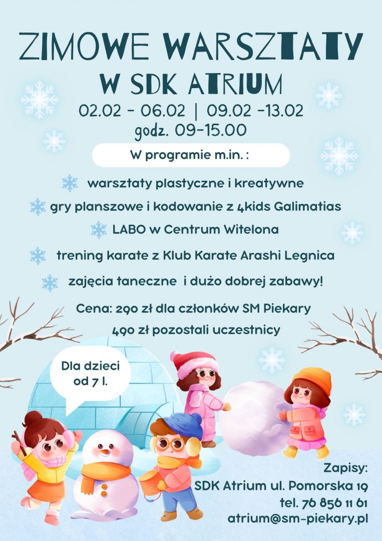 SDK Atrium zaprasza dzieci od 7. roku życia na zimowe warsztaty organizowane w dwóch turnusach: 2–6 lutego 2026 r. oraz 9–13 lutego 2026 r., w godzinach 9:00–15:00. W programie znalazły się m.in. zajęcia plastyczne i kreatywne, gry planszowe, kodowanie prowadzone przez Galimatias – sklep i warsztaty dla rodzin i placówek szkolnych, warsztaty w LABO w Centrum Witelona w Legnicy, zajęcia sportowe, w tym trening karate z Klubem Arashi, a także taniec i animacje rekreacyjne. Koszt udziału wynosi 290 zł dla członków SM Piekary oraz 490 zł dla pozostałych uczestników. Zapisy prowadzone są pod numerem telefonu 76 856 11 61.