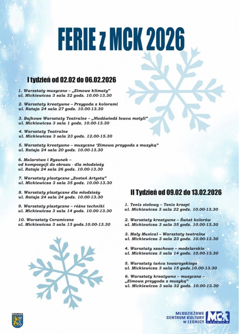 Młodzieżowe Centrum Kultury w Legnicy zaprasza dzieci i młodzież w wieku szkolnym z terenu miasta Legnica do udziału w otwartych, bezpłatnych warsztatach artystycznych, organizowanych w czasie ferii zimowych.