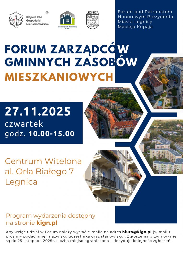 27 listopada w Centrum Witelona przy Alei Orła Białego 7 odbędzie się spotkanie w ramach Forum Zarządców Gminnych Zasobów Mieszkaniowych. Wydarzenie przygotowane zostało przez Krajową Izbę Gospodarki Nieruchomościami (KIGN) we współpracy z Zarządem Gospodarki Mieszkaniowej w Legnicy. Forum odbędzie się pod Patronatem Honorowym Prezydenta Miasta Legnicy Macieja Kupaja.