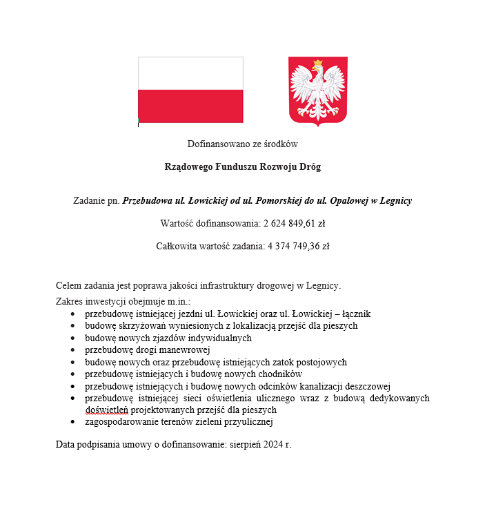 Zakończyła się przebudowa ul. Łowickiej. Trwają jeszcze ostatnie odbiory techniczne. Inwestycję zrealizowano ramach Legnickiego Programu Drogowego. Koszt to ok. 4 mln 374 zł brutto. Na realizację tego zadania Legnica otrzymała dofinansowanie w wysokości 2 mln 624 tys. zł z Rządowego Funduszu Rozwoju Dróg.