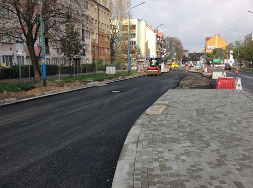 Prace na ul. Moniuszki wchodzą w końcowy etap. Obecnie na wyłączonej z ruchu jezdni zachodniej kładziona jest wiążąca warstwa nawierzchni asfaltowej. Pod koniec tygodnia rozpocznie się - pod warunkiem, że nie będzie padał deszcz - wylewanie na obu jezdniach ostatniej warstwy – ścieralnej z betonu asfaltowego. Roboty prowadzono tu także w sobotę.