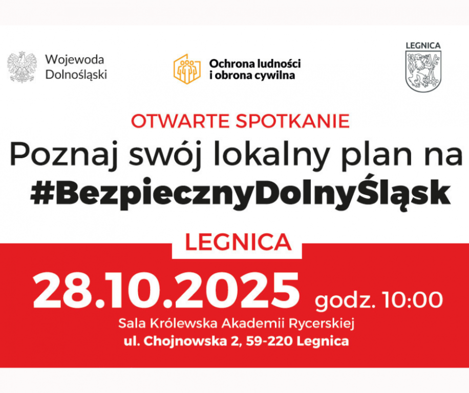 We wtorek, 28 października, w Sali Królewskiej Akademii Rycerskiej (ul. Chojnowska 2) w godzinach 10:00–12:00 odbędzie się otwarte spotkanie dla mieszkańców poświęcone ochronie ludności i obronie cywilnej.