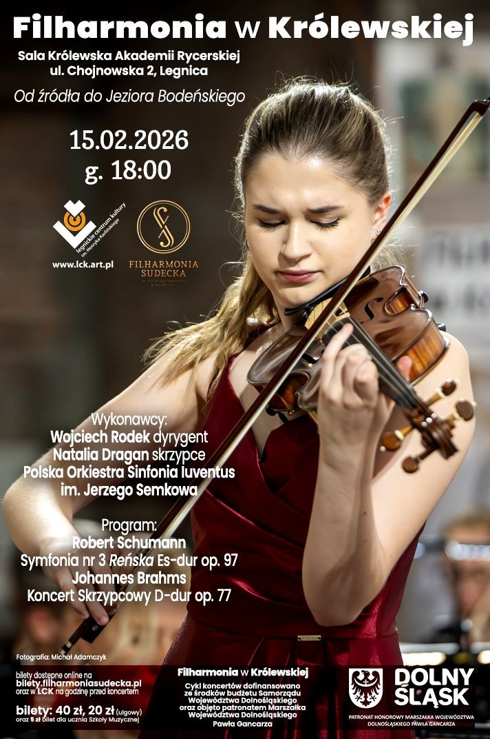W niedzielę, 15 lutego 2026 roku o godz. 18:00, Sala Królewska Akademii Rycerskiej w Legnicy wypełni się muzyką symfoniczną. Przed publicznością wystąpi Polska Orkiestra Sinfonia Iuventus pod dyrekcją Wojciecha Rodka, a partię solową wykona Natalia Dragan (skrzypce). Koncert odbędzie się w ramach cyklu „Filharmonia w Królewskiej”, który na stałe wpisał się w kalendarz wydarzeń kulturalnych miasta.