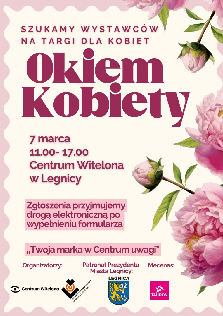 Centrum Witelona oraz Legnickie Centrum Kultury im. Henryka Karlińskiego w Legnicy zapraszają do udziału w kolejnej edycji targów dla kobiet „Okiem Kobiety”. Wydarzenie odbędzie się 7 marca 2026 roku, w godzinach 11:00–17:00, w siedzibie Centrum Witelona przy al. Orła Białego 7.
