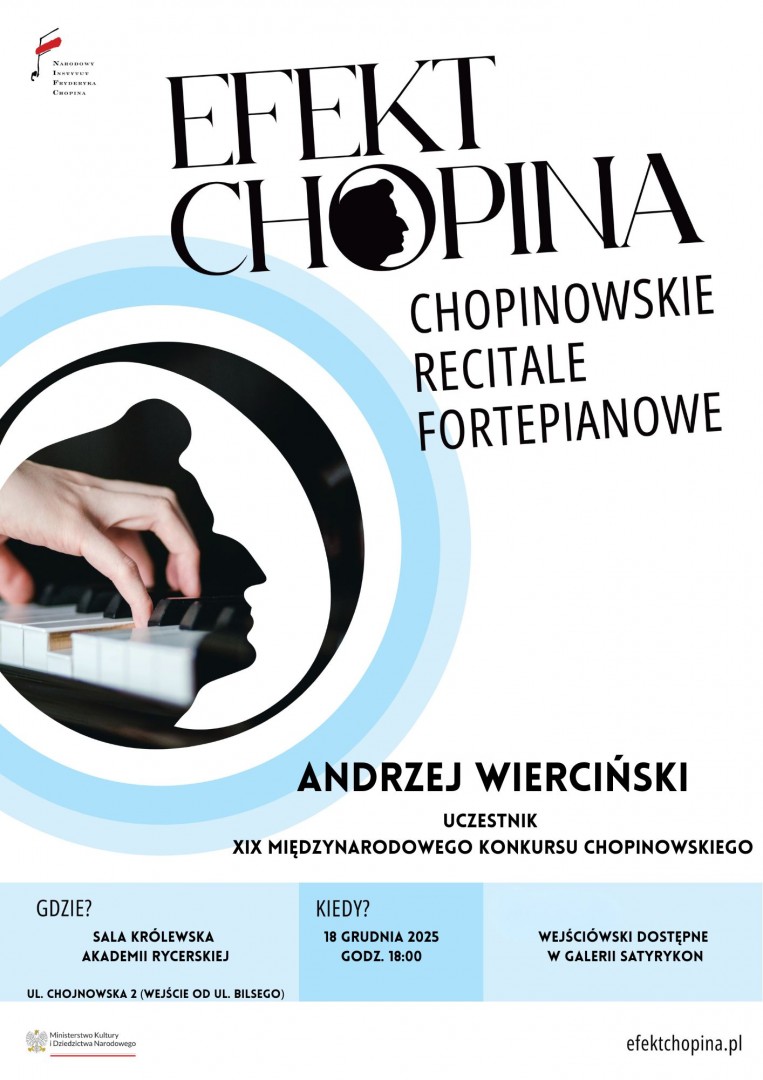 Narodowy Instytut Fryderyka Chopina oraz Legnickie Centrum Kultury zapraszają na kolejny recital w ramach cyklu „Efekt Chopina – Chopinowskie Recitale Fortepianowe”. W czwartek, 18 grudnia o godzinie 18.00, w Sali Królewskiej Akademii Rycerskiej wystąpi Andrzej Wierciński – pianista, uczestnik XIX Międzynarodowego Konkursu Pianistycznego im. Fryderyka Chopina i półfinalista jego XVIII edycji.