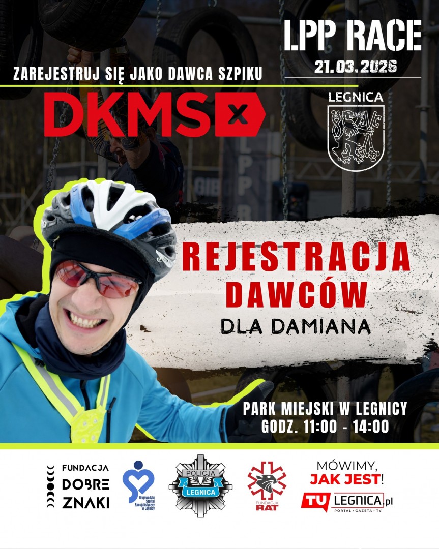 W sobotę, 21 marca, podczas biegu LPP RACE w Parku Miejskim, w godzinach 11:00–14:00 prowadzona będzie akcja rejestracji potencjalnych dawców szpiku dla Damiana Skowrona – funkcjonariusza policji z Jawora i podopiecznego Fundacji Dobre Znaki. Działania organizowane są wspólnie z Komendą Miejską Policji w Legnicy.