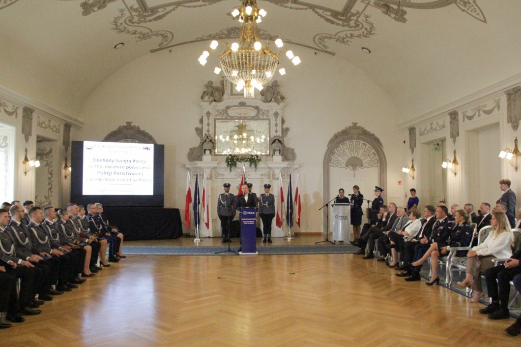 Uroczystości z okazji Święta Policji odbyły się dzisiaj (18 lipca) w Sali Królewskiej Akademii Rycerskiej. W tym roku obchodzimy 106. rocznicę powstania Policji Państwowej i 100-lecie służby kobiet w jej szeregach.