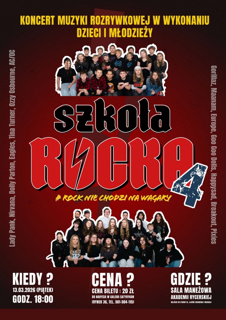W piątek, 13 marca 2026 r. o godz. 18.00, w Sali Maneżowej Akademii Rycerskiej odbędzie się czwarta edycja koncertu „Szkoła Rocka”.