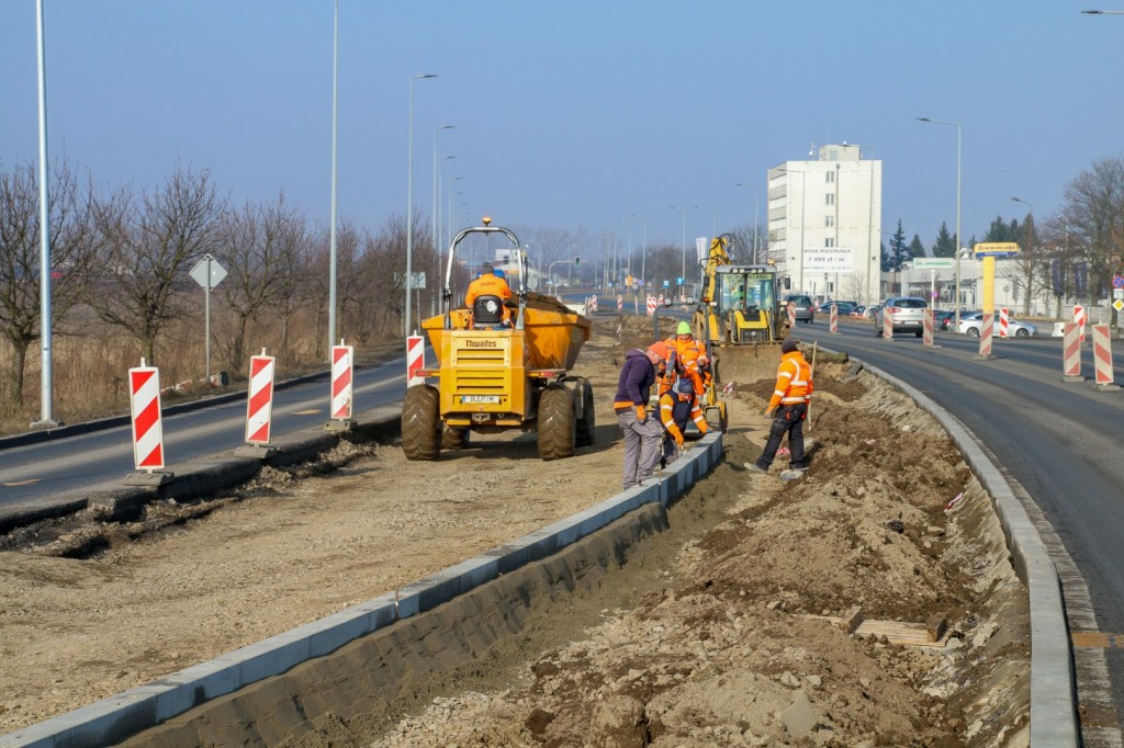 Obecnie prace koncentrują się na ostatnim etapie przebudowy pasa od strony miasta w kierunku Jawora. Ekipy budowlane układają krawężniki i domykają pierścień ronda. Równolegle finalizowane są roboty związane z kanalizacją deszczową – zakończono już usuwanie kolizji z siecią wodociągową, a w najbliższym czasie przebudowany zostanie ostatni przepust przy ul. Miejskiej.