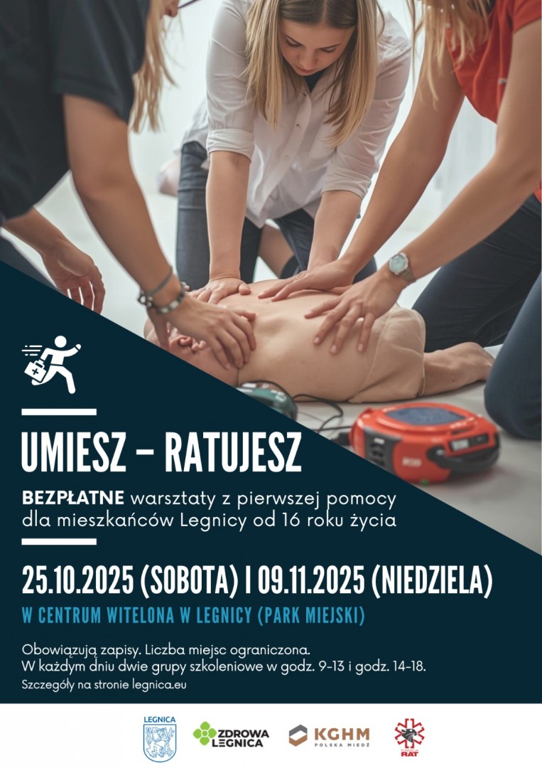 Warsztaty „Umiesz – ratujesz!” to część miejskiego programu „Zdrowa Legnica”, którego celem jest promocja zdrowego stylu życia, profilaktyki i bezpieczeństwa. Zachęcamy mieszkańców Legnicy do udziału w warsztatach – bo kiedy liczą się sekundy, umiesz = ratujesz.