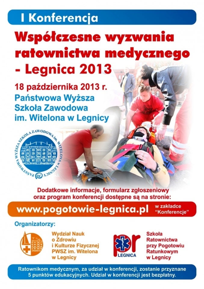 W piątek, 18 października br. w Państwowej Wyższej Szkole Zawodowej im. Witelona w Legnicy odbędzie się I Konferencja pt. „Współczesne wyzwania ratownictwa medycznego - Legnica 2013”. Organizatorem jest Wydział Nauk o Zdrowiu i Kulturze Fizycznej tej uczelni wraz ze Szkołą Ratownictwa przy Pogotowiu Ratunkowym.