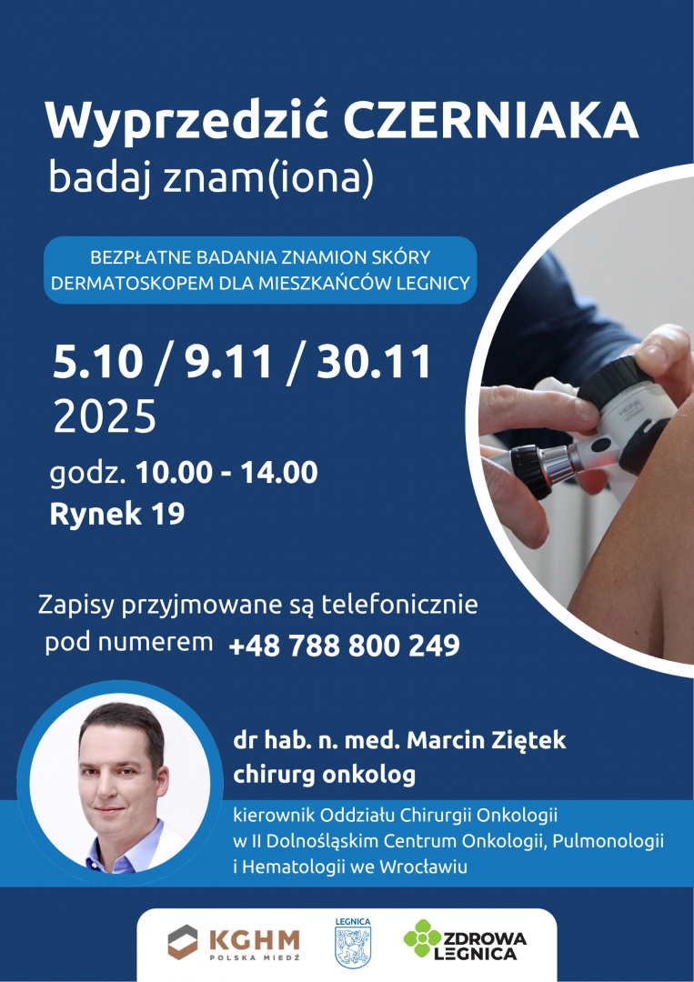 Legniczanie mogą skorzystać z bezpłatnych badań znamion skóry dermatoskopem. Pierwsze spotkanie ze specjalistą w ramach akcji „Wyprzedzić CZERNIAKA – badaj znam(iona)” odbędzie się już w najbliższą niedzielę 5 października, kolejne 9 i 30 listopada 2025 roku, w godzinach 10:00–14:00 w Rynku 19.