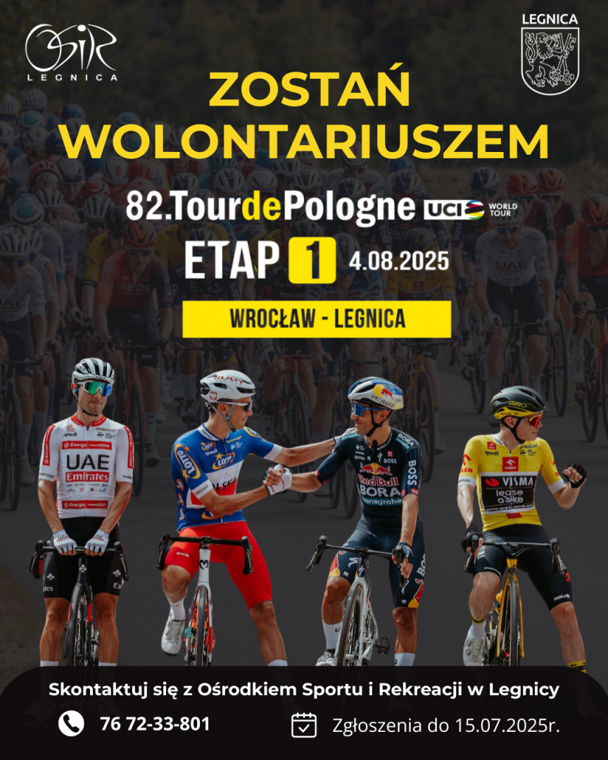 Ośrodek Sportu i Rekreacji w Legnicy poszukuje wolontariuszy do pomocy przy zabezpieczeniu trasy przejazdu Tour de Pologne Junior oraz mety głównego wyścigu. Akcja odbędzie się w poniedziałek, 4 sierpnia, w godzinach 12:00–17:00.