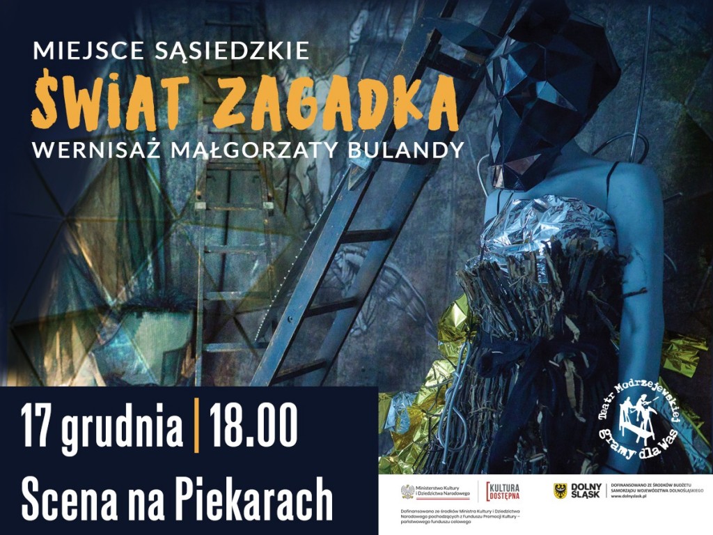 Prezentacja kostiumów i elementów dekoracji ze spektakli Teatru Modrzejewskiej autorstwa Małgorzaty Bulandy - jednej z najważniejszych współczesnych polskich scenografek. Ma w swoim portfolio ponad sto przedstawień w Polsce i innych krajach, spektakle z jej scenografią grane są na najważniejszych polskich scenach, m.in. w Teatrze Narodowym w Warszawie. Jej sztukę prezentowano na wystawach m.in. w Pradze (Prague Quadriennale 2003), na Festiwalu Szekspirowskim w Gdańsku, w Muzeum Śląskim – Centrum Scenografii Polskiej w Katowicach, w Muzeum Miedzi w Legnicy. W Teatrze Modrzejewskiej przepracowała ponad trzydzieści lat, współtworzyła tu ponad 70 przedstawień i wiele innych przedsięwzięć artystycznych i społecznych. Była współkreatorką koncepcji legnickiego grania w przestrzeniach nieteatralnych – zrujnowanych, industrialnych, historycznych. W ramach wernisażu wystawy „Świat zagadka” Bulanda proponuje także specjalną atrakcję – stworzy kostiumy na żywo we współpracy z widownią! Chętnych do wspólnej kreacji prosimy o przyniesienie ze sobą rzeczy, z których da się zrobić kostium. W grę wchodzą wszelkie przedmioty – byle nie nazbyt duże, ciężkie czy niebezpieczne. Pokaz zamknie koncert hip-hopowego duetu PEF! Muzyka PEF to autentyczność tekstów pokolenia milenialsów okraszona brzmieniem żywych instrumentów i ciepłem sampli z płyt winylowych. W 2022 światło dzienne ujrzał pierwszy album, który nosi po prostu tytuł „PEF”. Drugi album pt. „Kwestia czasu” ukazał się w tym roku na unikatowych pendrive'ach w kształcie kasety. Obydwu albumów można słuchać na platformach streamingowych i nabyć je w trakcie koncertu.