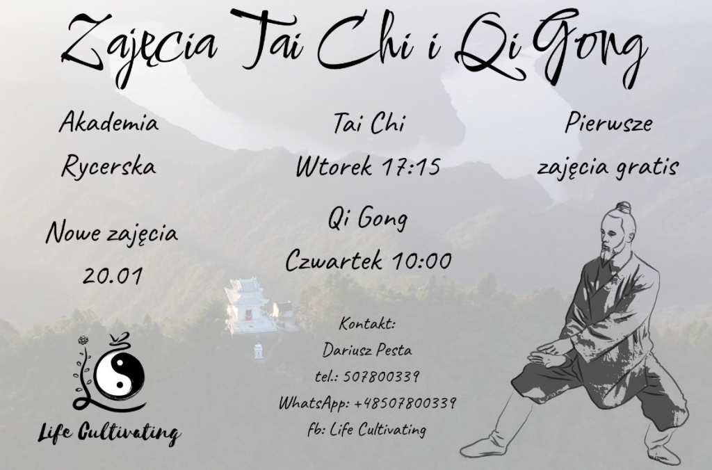 Tai Chi i Qi Gong to praktyki kultywujące energię witalną i odżywające życie. Wywodzą się z Chin i tam były praktykowane już od dawnych czasów. Są to praktyki, które mogę ćwiczyć młodzi, dorośli oraz seniorzy. Tak jak możliwości ciała zmieniają się z czasem, tak praktyka jest dostosowana do wieku. Metody te można ćwiczyć dla poprawy zdrowia i uspokojenia umysłu, jako sztukę walki, w celach uzdrawiania, a także dla głębszych realizacji duchowych. Na zajęciach skupiamy się na praktyce, mającej na celu regulowanie ciała, poprawę zdrowia i uspokajanie umysłu. Zajęcia odbywają się się we wtorki o godz. 17:15 (Tai Chi) oraz w czwartki o godz. 10:00 w sali baletowej nr 241 Akademii Rycerskiej (ul. Chojnowska 2, wejście od dziedzińca). Szczegółowych informacji udziela prowadzący Dariusz Pesta pod numerem telefonu 507 800 339. Pierwsze zajęcia gratis!