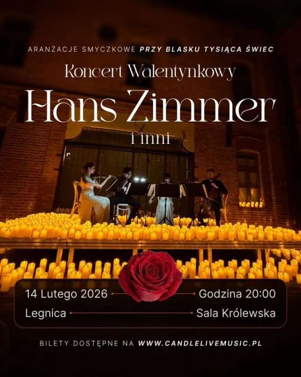 Zapraszamy na wyjątkowy koncert walentynkowy, podczas którego romantyzm spotyka się z potęgą filmowych emocji. W blasku setek świec zabrzmią najsłynniejsze tematy muzyki filmowej autorstwa Hansa Zimmera oraz innych wybitnych kompozytorów, w poruszających, instrumentalnych aranżacjach. Wydarzenie odbędzie się w Sali Królewskiej Akademii Rycerskiej w sobotę, 14 lutego o godzinie 20:00 (wejście od ul. Bilsego). Bilety w cenie 75-130 złotych są dostępne na stronie www.candlelivemusic.pl.