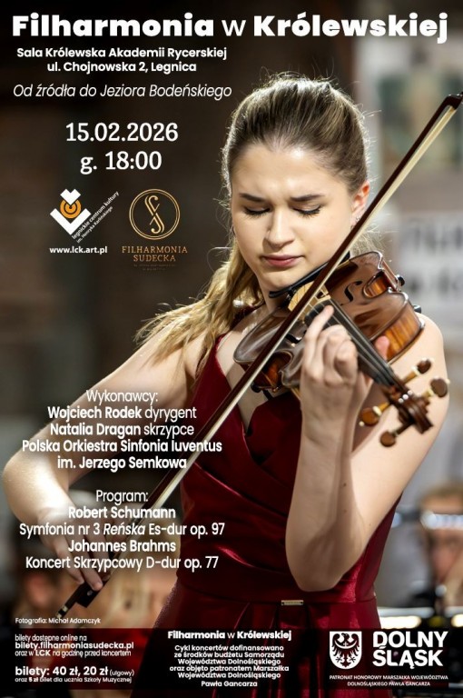 W niedzielę, 15 lutego, o godzinie 18:00 Sala Królewska Akademii Rycerskiej ponownie stanie się przestrzenią spotkania z cyklu „Filharmonia w Królewskiej”. Zapraszamy na muzyczną podróż „Od źródła do Jeziora Bodeńskiego”, wiodącą przez arcydzieła Roberta Schumanna i Johannesa Brahmsa. Usłyszymy Natalię Dragan (skrzypce) oraz Polską Orkiestrę Sinfonia Iuventus pod batutą Wojciecha Rodka. Bilety w cenie 40 złotych (bilet normalny), 20 złotych (ulgowy) i 5 złotych (dla uczniów Zespołu Szkół Muzycznych) są dostępne na stronie bilety.filharmoniasudecka.pl oraz na godzinę przed koncertem.